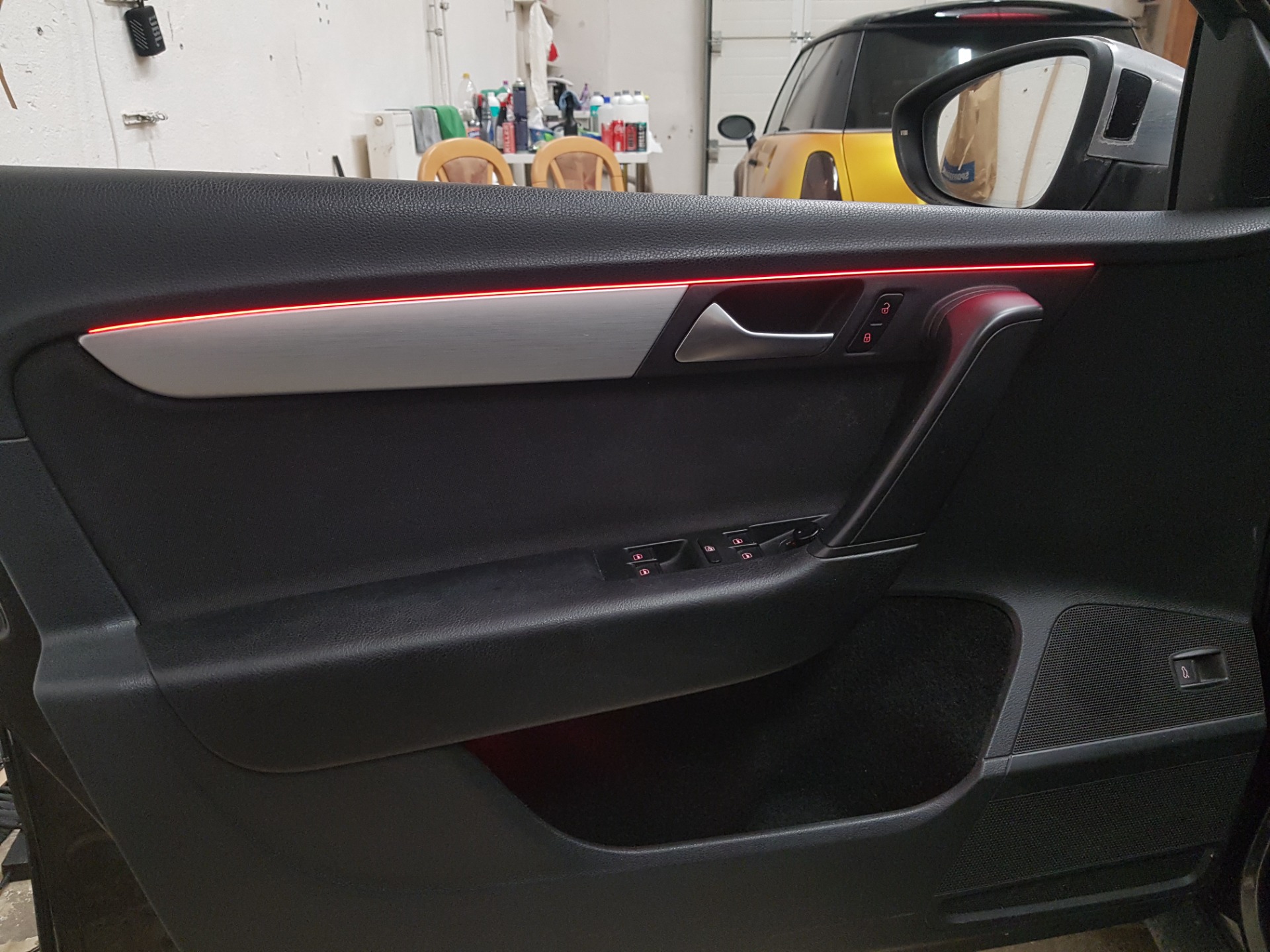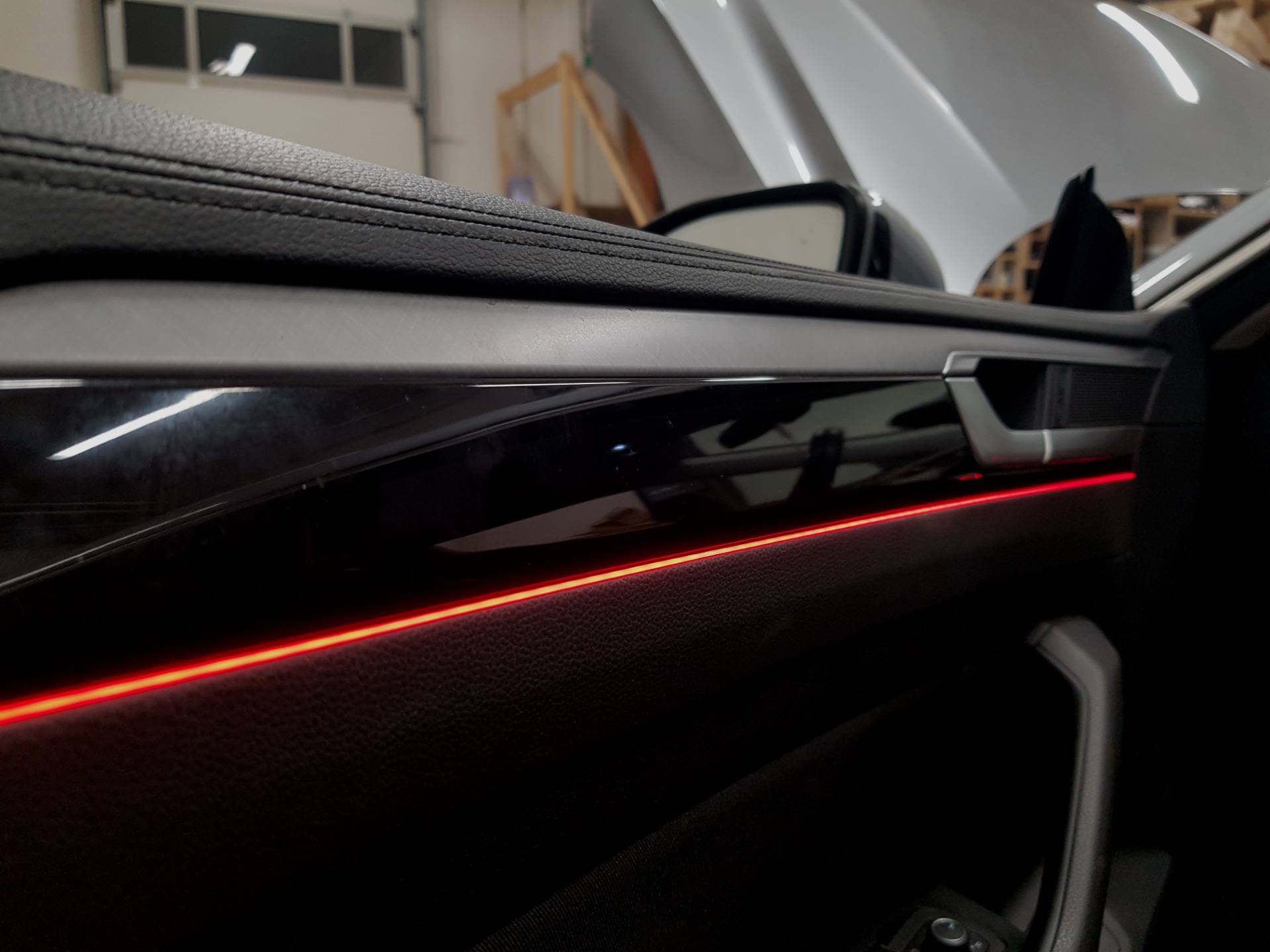 Táto služba je najčastejšie vyhľadávaná majiteľmi vozidiel, ktorí okrem bežnej užitkovej hodnoty samotného auta si radi urobia z času na čas radosť nejakým oživením vzhľadu. Ambientné osvetlenie ako také sa v ponuke koncernu VAG v danom segmente vozidiel objavilo až pri platforme MQB, tj približne od roku 2014. Staršie autá nikdy nemali možnosť takéhoto doplnku výbavy. Vyskúšal som množstvo produktov ktoré prinášajú túto myšlienku, avšak buď sa mi nepáčilo nie príliš vydarené podanie farieb, prípadne sa im nepáčila vstupná napäťová charakteristika PWM modulovaného napätia, alebo vydávali nepríjemné zvuky ich ovládacie boxy. Našiel som však produkt, ktorý spĺňa všetky tieto požiadavky a dovolím si ho používať pre komerčnú montáž. Vrámci ponuky služieb je teda možné doplniť takéto ambientné osvetlenie aj do starších vozidiel súčasne aj s podsvietením nôh.