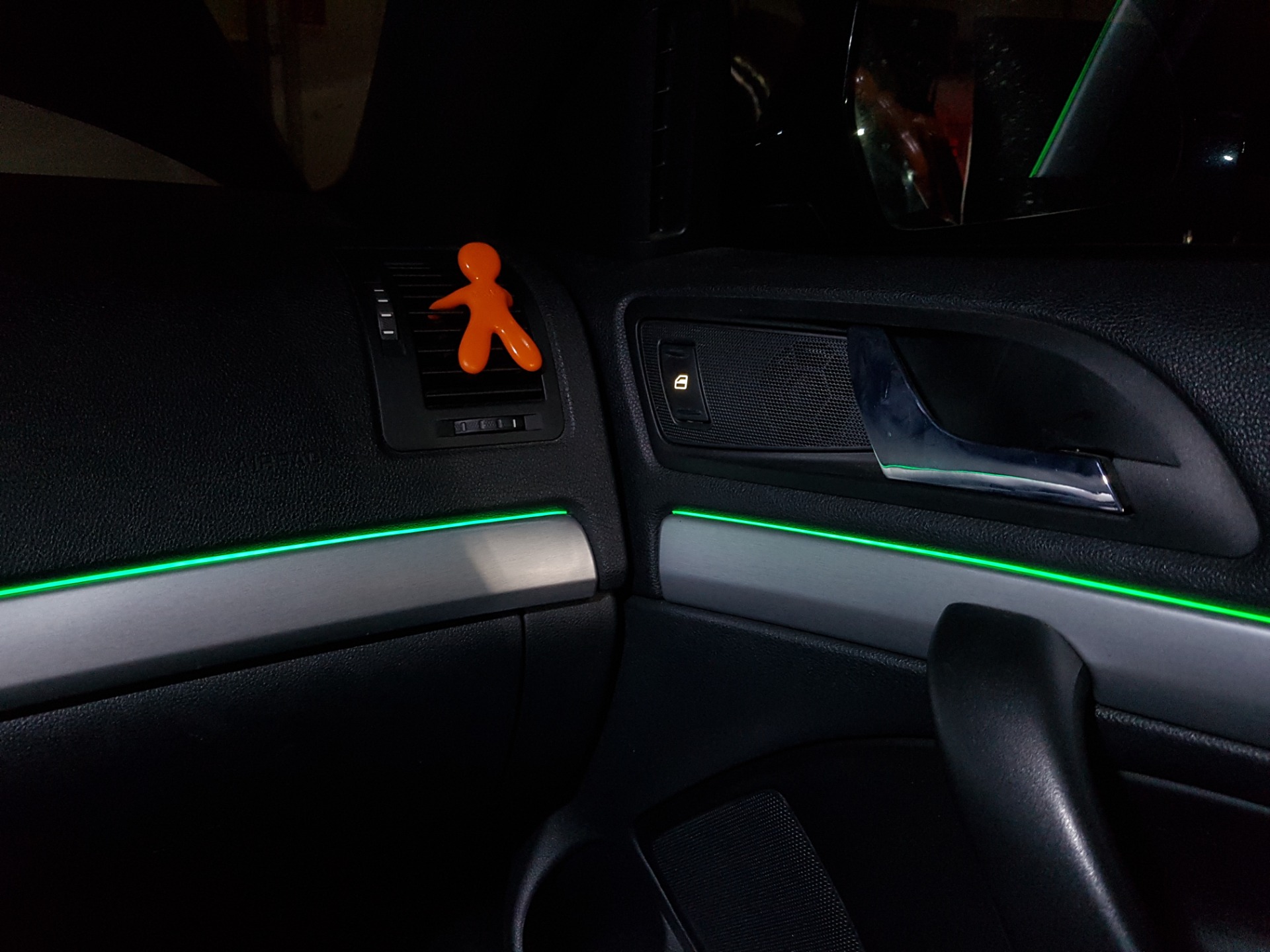 Táto služba je najčastejšie vyhľadávaná majiteľmi vozidiel, ktorí okrem bežnej užitkovej hodnoty samotného auta si radi urobia z času na čas radosť nejakým oživením vzhľadu. Ambientné osvetlenie ako také sa v ponuke koncernu VAG v danom segmente vozidiel objavilo až pri platforme MQB, tj približne od roku 2014. Staršie autá nikdy nemali možnosť takéhoto doplnku výbavy. Vyskúšal som množstvo produktov ktoré prinášajú túto myšlienku, avšak buď sa mi nepáčilo nie príliš vydarené podanie farieb, prípadne sa im nepáčila vstupná napäťová charakteristika PWM modulovaného napätia, alebo vydávali nepríjemné zvuky ich ovládacie boxy. Našiel som však produkt, ktorý spĺňa všetky tieto požiadavky a dovolím si ho používať pre komerčnú montáž. Vrámci ponuky služieb je teda možné doplniť takéto ambientné osvetlenie aj do starších vozidiel súčasne aj s podsvietením nôh.