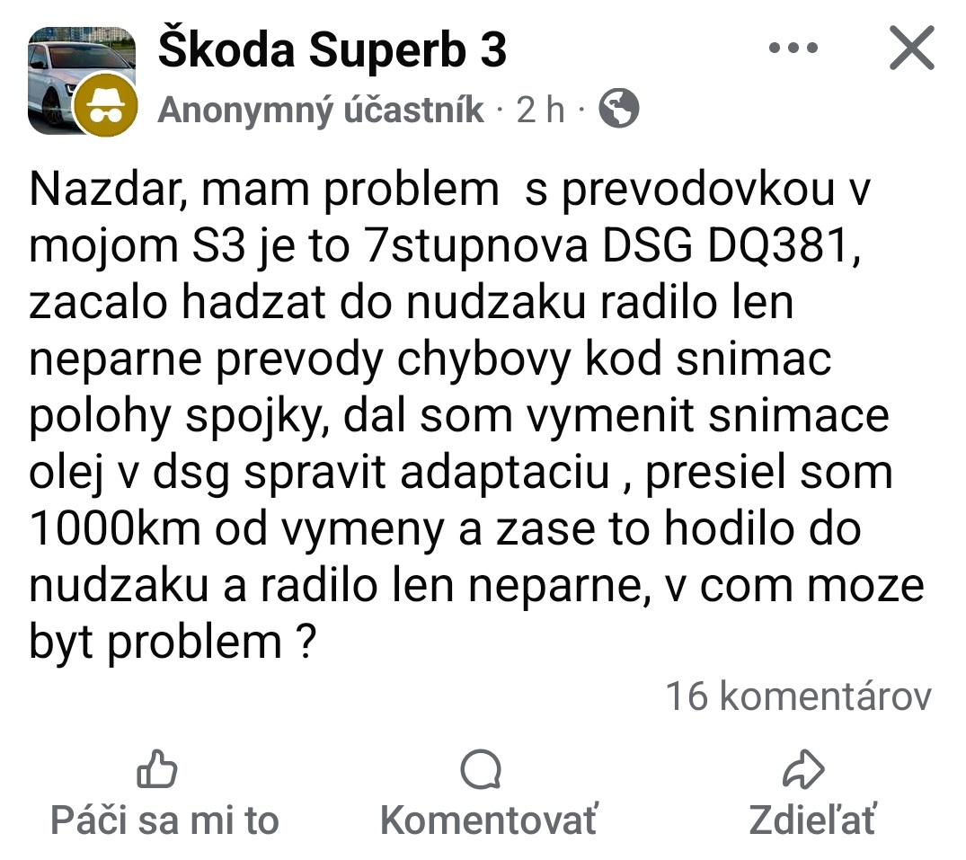 Váhate či olej v DSG vymeniť pri oprave alebo nie? Častokrát sa mi totiž stáva že sa mi zákazníci ozvú aj 1000km po deklarovanej výmene oleja v prevodovke a požadujú olej zachytiť a dopustiť. Realita však býva taká, že veľa mechanikov pri výmene oleja v prevodovke vymontuje len jeden výpustný šrób a teda nevypustia olej z mechatroniky a prednej časti prevodovky z druhého výpustného šróbu ktorý je pri DQ381/DQ500 na to určený. V prevodovke tak vďaka tejto chybe zostanú cca 2L oleja, ktorý vie kontaminovať novú náplň. Obsahuje totiž materiál zo spojkových lamiel a je čiastočne aj tepelne zdegradovaný. Takto zdegradovaný olej kontaminovaný materiálom zo spojkových lamiel ktoré plávajú v oleji spôsobuje ďalšie nadmerné opotrebenie spojkových lamiel, nakoľko takto kontaminovaný olej pôsobí ako brúsivo. Pri oprave mechatroniky sa jej demontážou dá vypustiť dodatočne približne 1 liter oleja ktorý je pod ňou a v otvoroch ktoré vedú do mechanickej časti prevodovky oproti hoc aj správnej výmene oleja (pomocou oboch výpustných šróbov). Zvyšné zostávajúce množstvo (ktoré sa nachádza v spojkovom koši a olejovom čerpadle prevodovky) sa dá z prevodovky odstrániť jedine jej kompletným rozložením. Smerujem tým k jednému. Riešenie tohto problému s mechatronikou je naozaj ideálnym momentom pre výmenu oleja v prevodovke nakoľko ostávajúce množstvo oleja v prevodovke ktoré kontaminuje novú náplň je menšie oproti tomu, ktoré tam ostáva pri pravidelnej údržbe. Finálne rozhodnutie je ale samozrejme na zákazníkovi a rešpektujem ho.