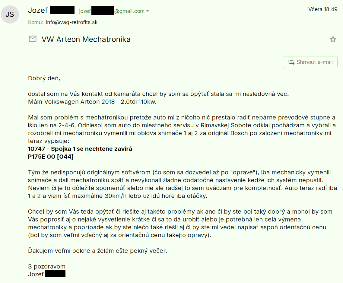 V prípade záujmu o opravu Vašej mechatroniky ma prosím kontaktujte, najlepšie telefonicky kde preberieme detaily a symptómy závady a možné spôsoby opravy